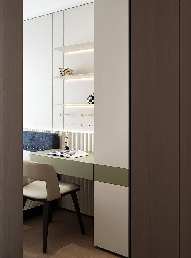 主卧延续了整体的设计语言。墨绿色悬浮床头的设计既满足收纳需求,又成为空间的视觉焦点。对称的布局营造出安定的休憩氛围,而悬空的置物板则展现了现代设计对实用美学的追求。